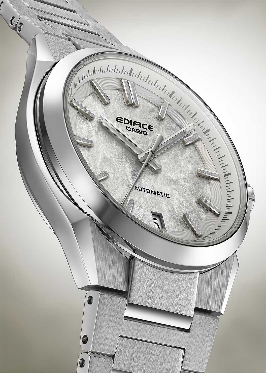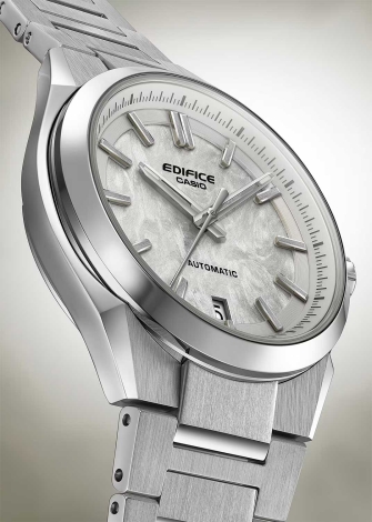 Edifice. Мужские часы. В механизме 24 камня, частота 21600 полуколебаний в час. Запас хода 40 часов. Возможность ручного завода. Защищены от магнитных полей. Циферблат выполнен из кованого карбона и защищен прочным сапфировым стеклом. Метки в виде штрихов. Окошко даты находится в положении 6 часов. Прозрачная задняя крышка с винтовым фиксатором. Литой браслет с тройной раскладывающейся застежкой, расстегиваемой одним касанием.