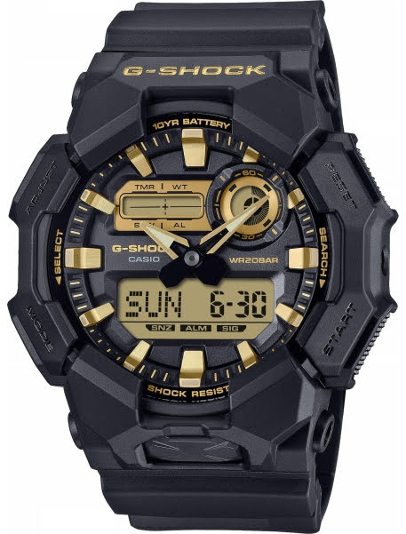 релиз 2025 года из серии G-SHOCK GA-010 в крупном брутальном матовом черном корпусе со стильным аналого-цифровым циферблатом золотого оттенка. Модели серии GA-010 получили харизматичный агрессивный внешний вид и технологию Carbon Core Guard: модуль часов защищает 2 слоя корпуса, внешний полимерный и внутренний легкий и сверхпрочный с углеродным армированием, а циферблат покрыт закаленным минеральным стеклом. На борту модели привычная для джишоков ударопрочность, водозащита в 200 метров и еще более десятка стандартных часовых функций. Отдельно отметим срок службы батареи, здесь от одного элемента питания часы смогут работать до 10 лет. Сверх-яркая подсветка При нажатии на кнопку подсветки экран ярко освещается в ультрамодный цвет. Циферблат подсвечивается ярким светодиодом. Настраиваемое послесвечение 1,5 или 3сек. Цвет подсветки: белый. Необритовое светонакопительное покрытие обеспечивает длительное послесвечение в темноте даже после кратковременного нахождения на свету. Ударопрочность Ударопрочная конструкция защищает от ударов и вибрации. Функции отключения/включения звука и перемещения стрелок для беспрепятственного просмотра информации на цифровых дисплеях. Функция мирового времени Отображение текущего времени в основных 48 городах и конкретных областях по всему миру. Функция секундомера - 1/10 сек. - 24 часов Прошедшее время, время прохождения круга и время окончания измеряются с точностью до десятой доли секунды. Пределы измерения часов составляет 24 часов. Таймер - 1/1 сек. - 1 час таймеры обратного отсчета напомнят Вам о текущих или особенных событиях, издав звуковой сигнал в установленное время. Время можно предварительно настроить от 1 секунды и до 1 часа. Часы могут затем автоматически начать отсчет в обратную сторону в установленное время. Эта модель имеет три независимых таймера - 5 ежедневных будильников Будильник напомнит Вам о повторяющихся событиях с помощью звукового сигнала, установленного Вами на определенное время. Вы также можете активировать почасовой сигнал времени, сообщающий о каждом полном часе. Эта модель имеет пять независимых будильников для оповещения о важных встречах. Функция повтора будильника