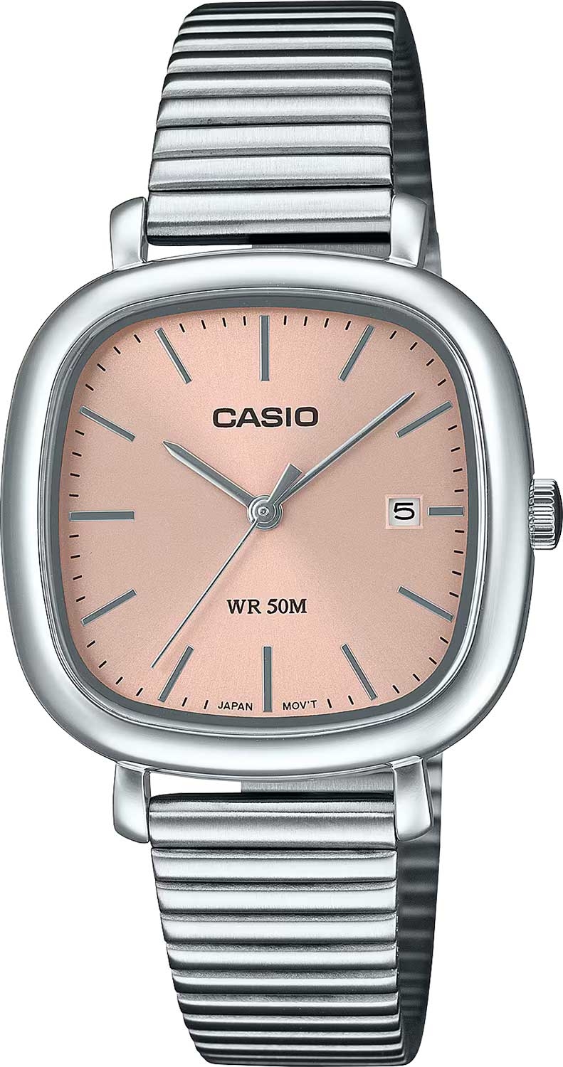 Standard. Женские часы со стальным корпусом. Циферблат с метками в виде штрихов выполнен по технологии Sunray (солнечные лучи). Окошко даты находится в положении 3 часа. Рифленая заводная головка. Батарея рассчитана на 3 года. Браслет с регулируемой застежкой.