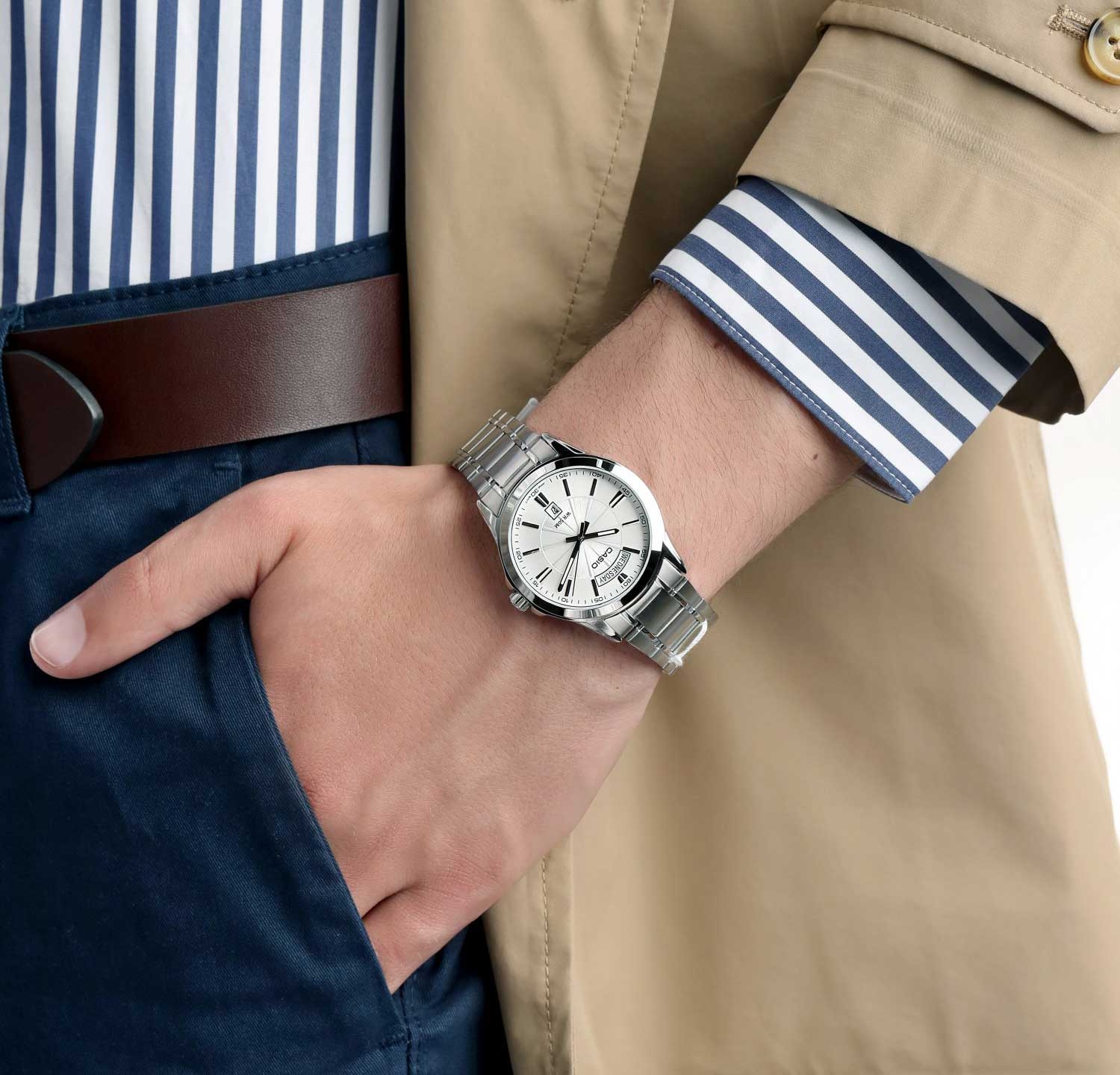 Standard. Мужские часы с круглым корпусом. Циферблат с метками в виде штрихов. Окошко даты находится в положении 6 часов. Окошко дня недели находится в положении 12 часов. Заводная головка с защитой. Батарея рассчитана на 3 года. Браслет с тройной раскладывающейся застежкой, расстегиваемой одним касанием.