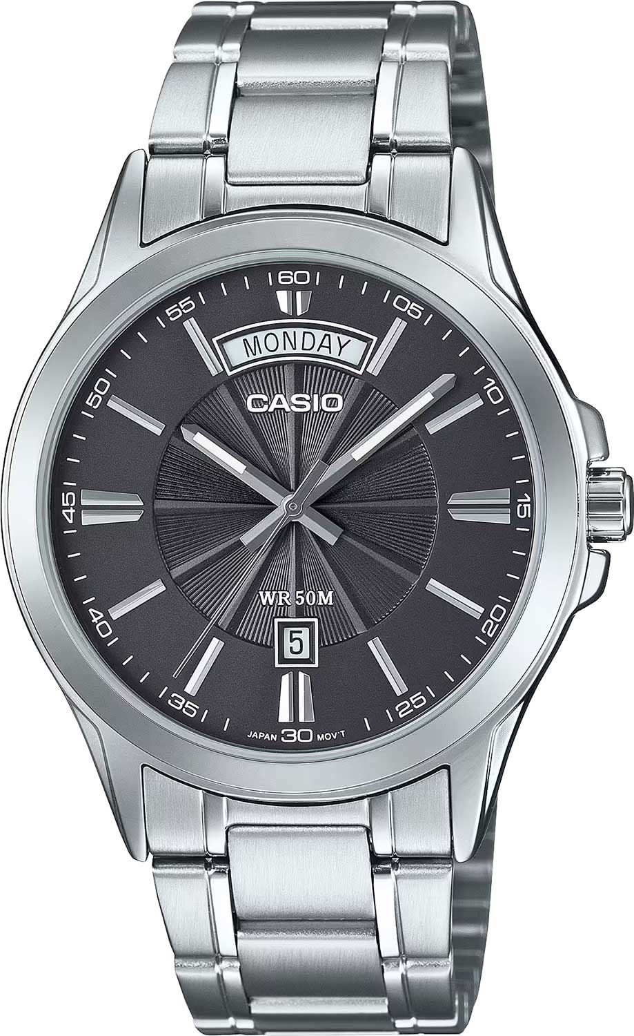 Standard. Мужские часы с круглым корпусом. Текстурный циферблат с метками в виде штрихов. Окошко даты находится в положении 6 часов. Окошко дня недели находится в положении 12 часов. Заводная головка с защитой. Батарея рассчитана на 3 года. Браслет с тройной раскладывающейся застежкой.