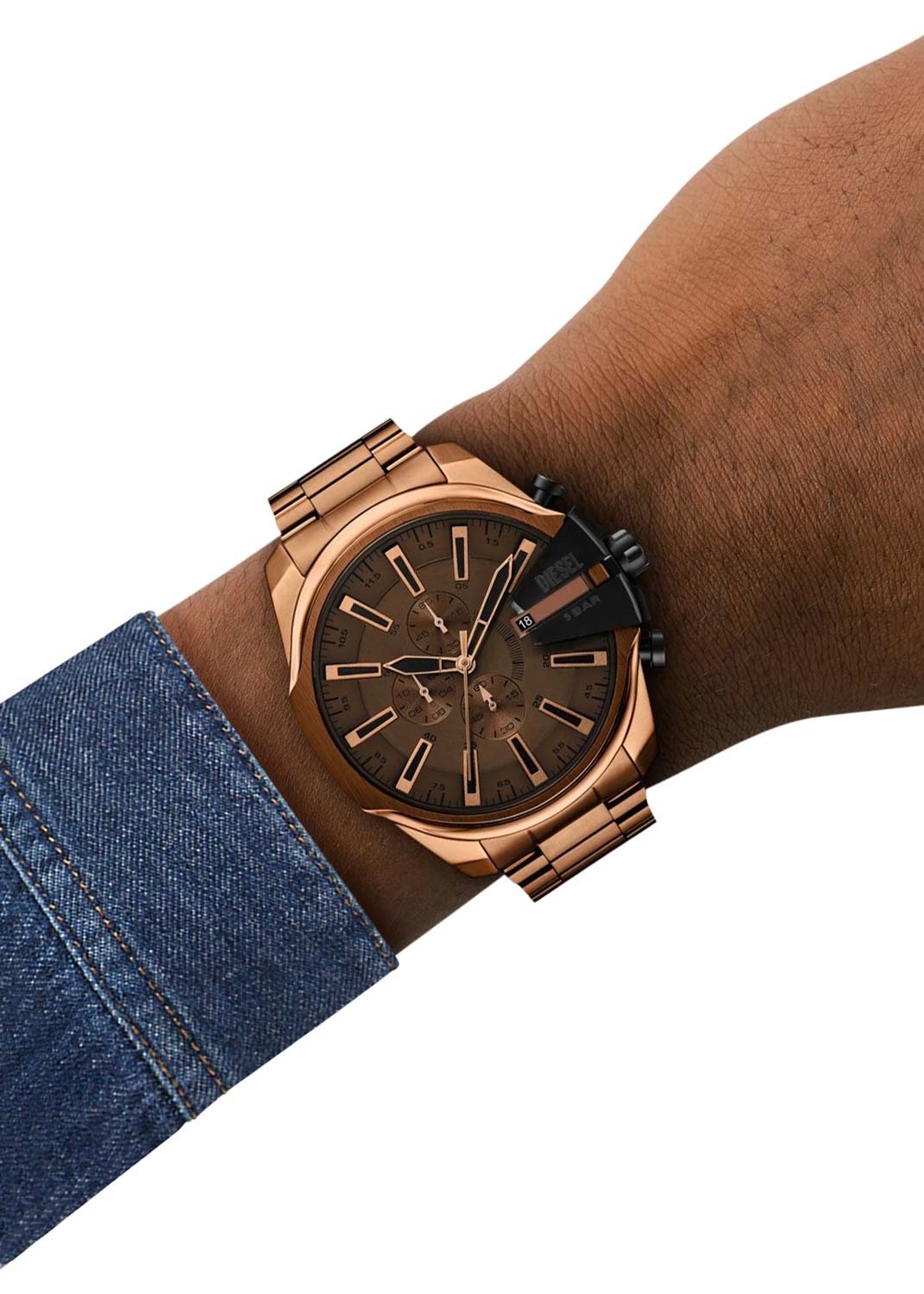 Mega Chief Slim. Мужские часы с хронографом и секундомером. Корпус из нержавеющей стали в матовом исполнении. Циферблат с логотипом бренда выполнен по технологии Sunray (солнечные лучи) и защищен минеральным стеклом. Окошко даты находится в положении 3 часа. Метки в виде штрихов. Рифленая заводная головка. Стальной браслет с раскладывающейся застежкой.