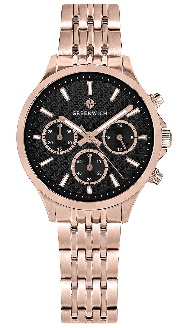 Часы GW 363.40.31 серии Mermaid - находка для тех, кто ищет надежные и, в тоже время, элегантные часы. Кварцевый механизм, установленный в 35-миллиметровый корпус из нержавеющей стали с PVD-покрытием из розового золота, оснащен функционалом хронографа: вынесенные на дополнительные индикаторы стрелки позволяют засекать время в минутах и секундах. Кроме этого, на черном циферблате разместили индикатор 24-часов. Каждый из индикаторов выделен накладной рамкой с зеркальной полировкой. Накладные риски и центральные стрелки покрыты люминесцентным составом. Элегантность модели подчеркивает гильоше: выполненное в виде волнообразных линий, оно дарит циферблату объем и глубину. В часах установлено минеральное стекло. Водостойкость 10 атмосфер. Хронограф серии Mermaid можно приобрести на браслете из звеньев, отполированных по-разному, с использованием зеркальной полировки и матирования. Застежка-клипса обладает удобной конструкцией: открыть ее можно с помощью двух боковых кнопок.