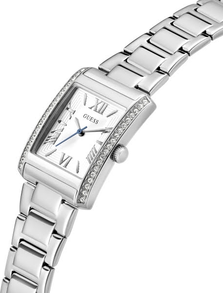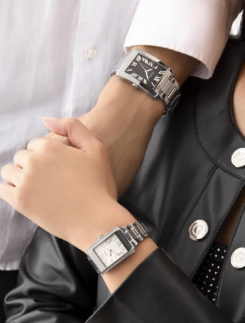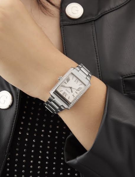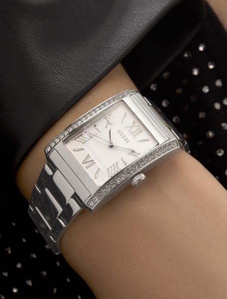 Наручные часы для стильных женщин. Стальной прямоугольный корпус. Циферблат в центре выполнен по технологии Sunray (солнечные лучи). Метки в виде штрихов и римских цифр. Рифленая заводная головка. Браслет с раскладывающейся застежкой.