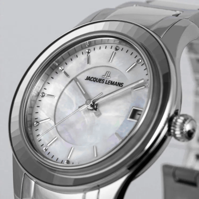 Объемный циферблат из натурального перламутра — прием, который дизайнеры Jacques Lemans используют при выпуске последних серий женских часов и который явно нравится поклонницам бренда. В новой модели кварцевых часов серии 1-2194 его тоже применили, акцентируя таким образом внимание на трех центральных стрелках, часовая и минутная с люминесцентным покрытием. Белый циферблат оснащен и окошком даты на трех часах, оно выделено накладной рамкой. В каждой, отполированной до зеркального блеска риске отражается сияние кристалла Swarovski - на циферблате их ровно двенадцать и, кроме декоративной функции, они помогают определять время. Корпус диаметром 34 мм сделан из нержавеющей стали. Его лаконичность сочетается с роскошью широкого безеля, на гранях которого лучики света играют при любом движении руки. Браслет часов собран из стальных звеньев и удобной в использовании застежки-клипсы с двумя боковыми кнопками. Часы 1-2194 - тот самый аксессуар, который будет уместен независимо от ситуации: и на деловом совещании, на дружеской вечеринке, и во время торжественного выхода в свет.