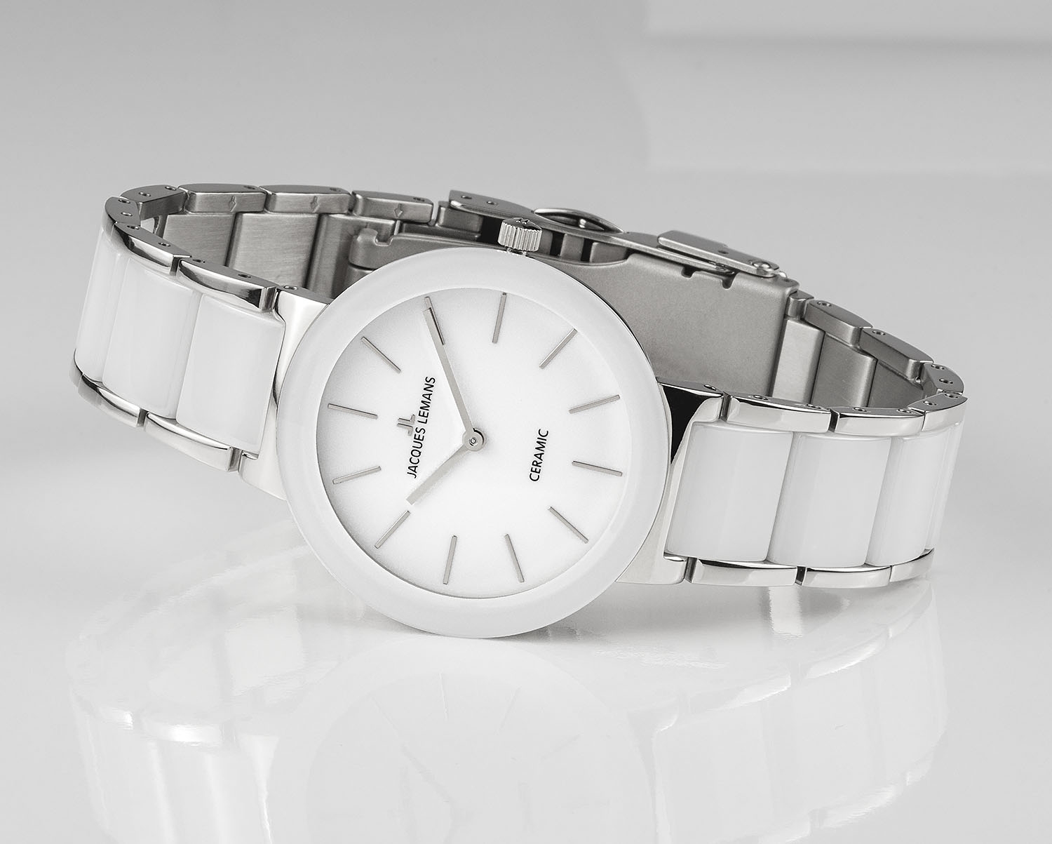 Кварцевые часы серии High Tech Ceramic выполнены в модном стиле «минимализм». Их лаконичный корпус диаметром 34 мм сделан из нержавеющей гипоаллергенной стали. На матовом белом циферблате расположены хорошо читаемые риски и стрелки часов и минут. В модели установлено ударопрочное минеральное стекло Crystex. Повышенная водостойкость равна 10 атмосфер. В качестве материала для центральных звеньев браслета выбрана высокотехнологичная керамика белого цвета. Этот материал способен не только стойко сопротивляться появлению микроцарапин, но и подарить приятные тактильные ощущения при использовании — он быстро достигает комфортной температуры тела. Браслет дополняет надежная застежка-клипса с логотипом бренда Jacques Lemans. Эти элегантные и эффектные часы станут яркой деталью любого образа: от повседневного до вечернего.
