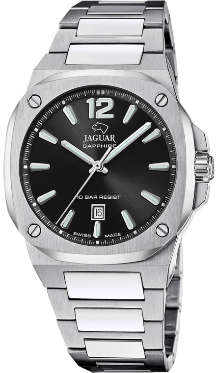 Мужские классические часы на каждый день. Коллекция RC. Кварцевый швейцарский калибр Ronda 705. 41-мм подушкообразный корпус, плоский сатинированный безель с четырьмя декоративными винтами. Черный циферблат с узором Sunray, накладные индексы и стрелки с люминофором, апертура даты на «6 часах». Интегрированный браслет с широким средним рядом полированных звеньев.