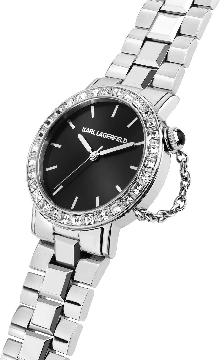 Женские наручные часы. Круглый стальной корпус декорирован кристаллами. Циферблат выполнен по технологии Sunray (солнечные лучи), дополнен логотипом бренда и защищен минеральным стеклом. Метки в виде штрихов. Заостренные прямоугольные стрелки в стиле Baton. Рифленая заводная головка на цепочке. Браслет с раскладывающейся застежкой.