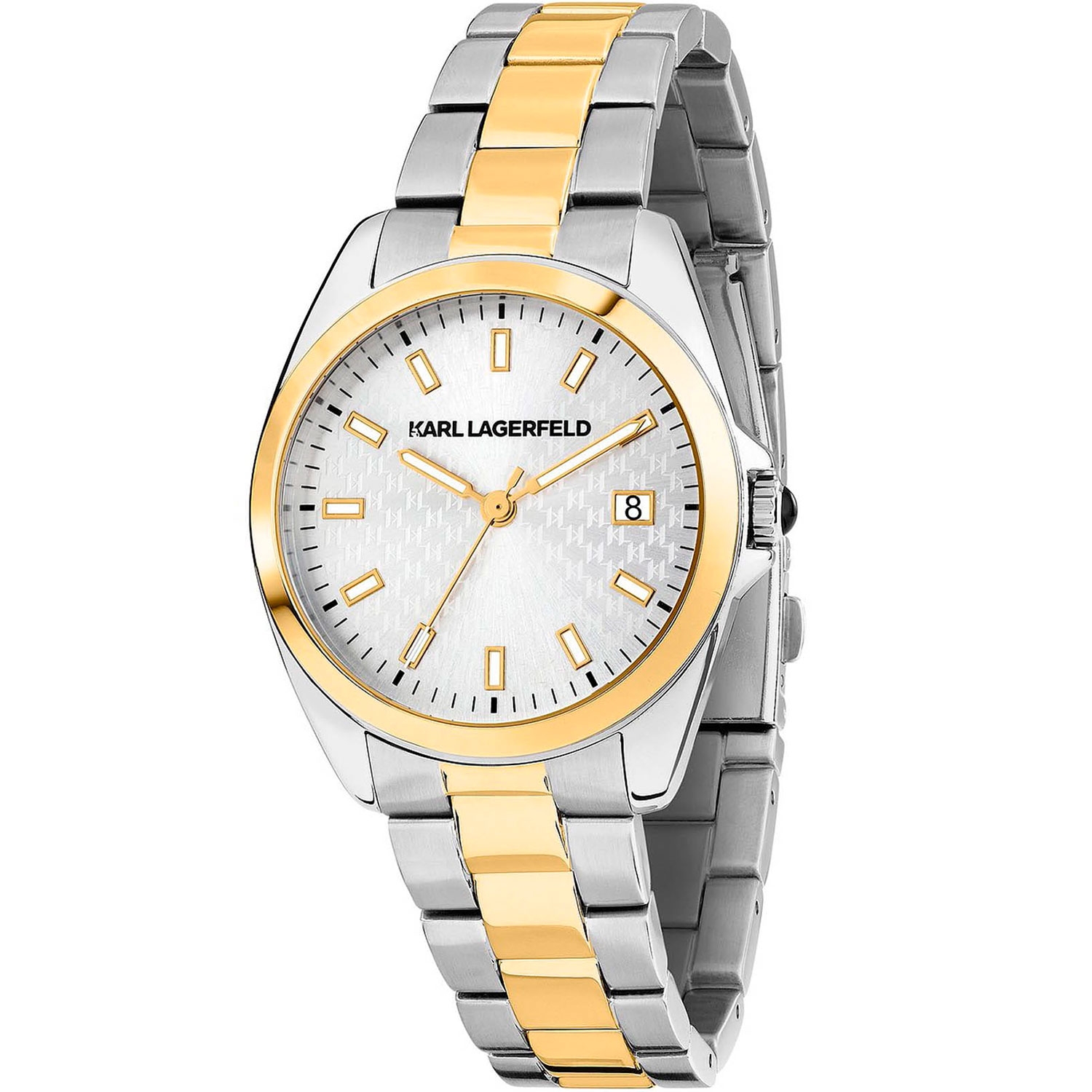 Женские наручные часы. Круглый стальной корпус. Циферблат с монограммой KL дополнен логотипом бренда и защищен минеральным стеклом. Метки в виде штрихов. Заостренные прямоугольные стрелки в стиле Baton.Метки и стрелки с люминесцентным покрытием, которое светится в темноте после непродолжительной зарядки на свету. Окошко даты находится в положении 3 часа. Рифленая заводная головка с защитой. Браслет с раскладывающейся застежкой.