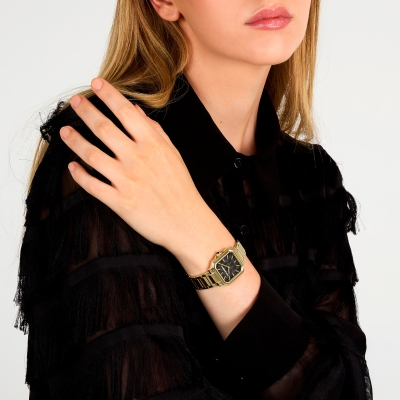 Женские кварцевые часы. Центральные часовая и минутная стрелки. Черный циферблат. Квадратный корпус выполнен из нержавеющей стали с IP покрытием цвета желтого золота. Размер корпуса составляет 33 х 27,8 мм, толщина 8,1 мм. Заводная головка с защитой. Стальной браслет с покрытием, раскладывающаяся застежка. Прочное минеральное стекло устойчивое к мелким механическим повреждениям. Водостойкость WR 30 (брызги).
