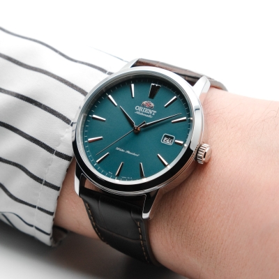 Мужские механические часы с автоподзаводом. Центральные часовая, минутная и секундная стрелки. Апертура даты в позиции 3 часов. Зеленый циферблат. Круглый корпус выполнен из нержавеющей стали. Диаметр корпуса составляет 41,6 мм. Коричневый кожаный ремешок, стандартная застежка.