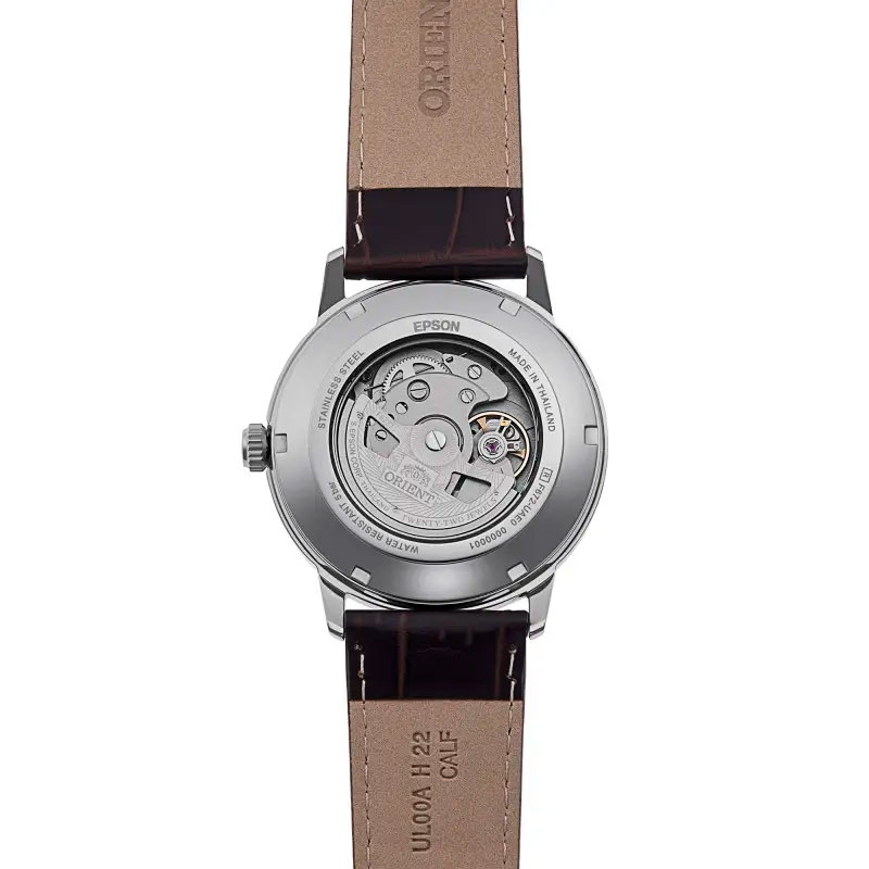 Мужские механические часы с автоподзаводом. Калибр механизма F6722. Запас хода 40 часов. Центральные часовая, минутная и секундная стрелки. Апертура даты в позиции 3 часов. Коричневый циферблат. Круглый корпус выполнен из нержавеющей стали. Диаметр корпуса составляет 41,6 мм. Коричневый кожаный ремешок шириной 22 мм, стандартная застежка.