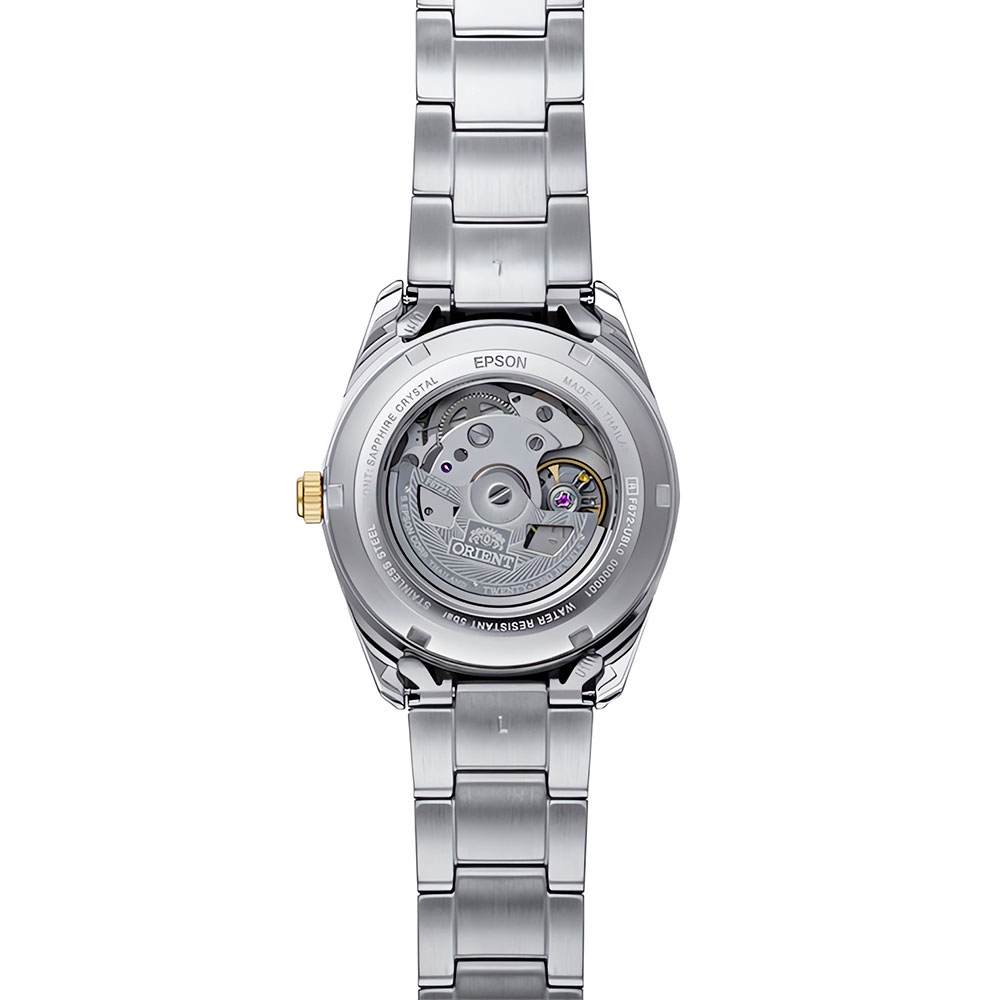 Мужские механические часы с автоподзаводом (с возможностью ручного подзавода). Калибр механизма F6722 на 22 камнях. Частота 21 600 полуколебаний в час. Центральные часовая, минутная и секундная стрелки. Апертура даты в позиции 3 часов. Серебристый циферблат. Круглый корпус выполнен из нержавеющей стали с частичным IP покрытием цвета желтого золота. Диаметр корпуса составляет 38,5 мм. Стальной браслет с частичным покрытием, раскладывающаяся застежка. Устойчивое к возникновению царапин сапфировое стекло. Прозрачная задняя крышка. Водостойкость WR 50