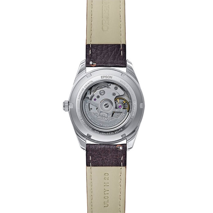 Мужские механические часы с автоподзаводом (с возможностью ручного подзавода). Калибр механизма F6722 на 22 камнях. Частота 21 600 полуколебаний в час. Центральные часовая, минутная и секундная стрелки. Апертура даты в позиции 3 часов. Коричневый циферблат. Круглый корпус выполнен из нержавеющей стали с частичным IP покрытием. Диаметр корпуса составляет 38,5 мм. Коричневый кожаный ремешок, раскладывающаяся застежка. Устойчивое к возникновению царапин сапфировое стекло. Прозрачная задняя крышка. Водостойкость WR 50