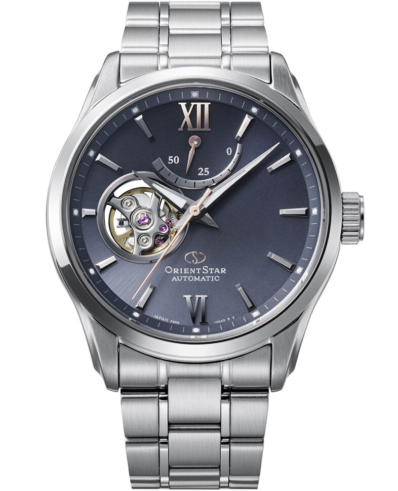 Contemporary. В механизме 22 камня, частота 21600 полуколебаний в час. Ретроградный указатель запаса хода до 50 часов. Возможность ручного завода. Функция stop-second. Защищены от магнитных полей (до 4800 А/м). Сквозь прозрачное окошко на циферблате можно наблюдать за работой механизма часов. Циферблат выполнен по технологии Sunray (солнечные лучи). Накладные метки в виде штрихов и римских цифр VI и XII. Клиновидные стрелки в стиле Dauphine. Рифленые кнопки и заводная головка. Завинчивающаяся прозрачная задняя крышка с минеральным стеклом. Надежный стальной браслет с раскладывающейся застежкой.