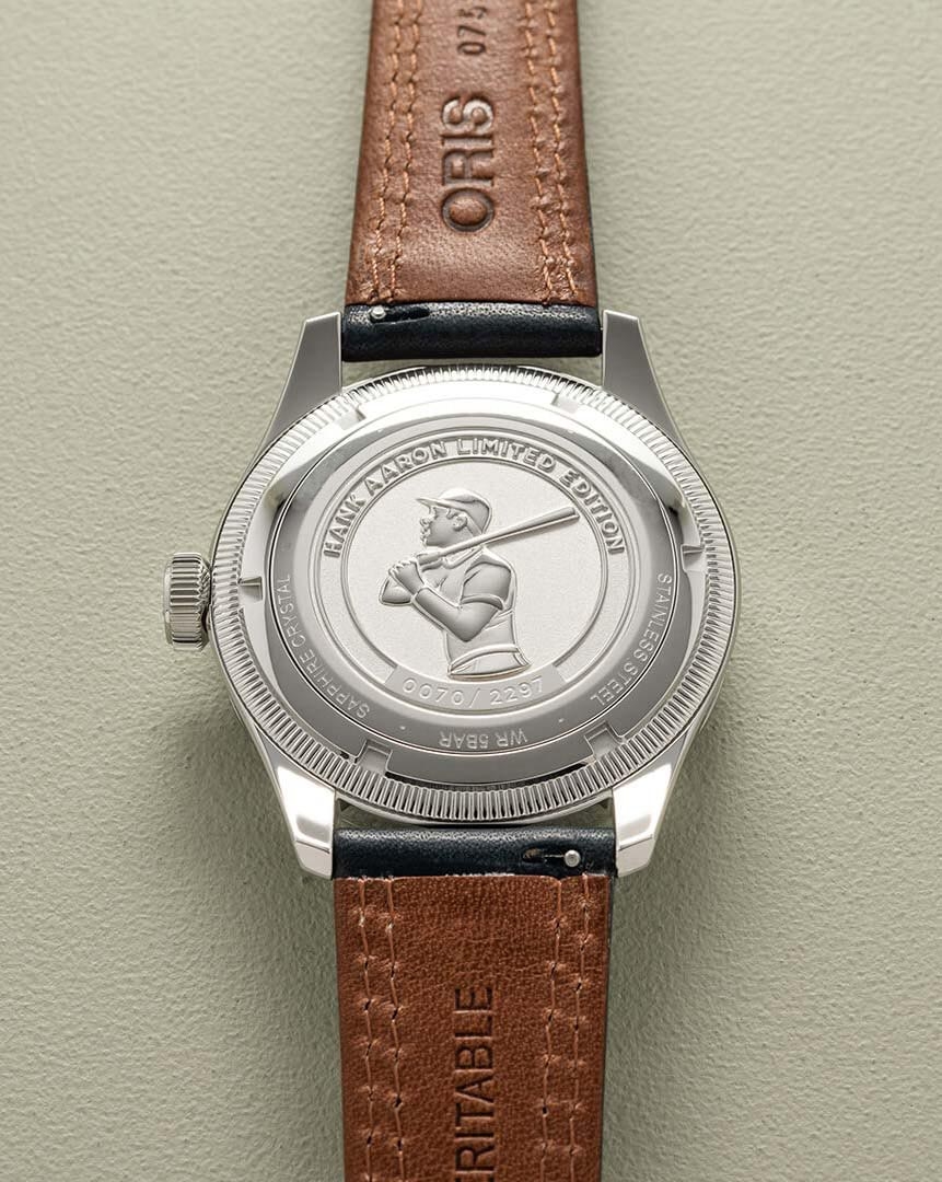 С огромной радостью представляем Hank Aaron Limited Edition - красно-бело-синюю версию Big Crown Pointer Date, созданную в честь жизни и наследия легенды бейсбола и гуманиста Хэнка Аарона. Хэнк Аарон, скромный бейсболист, в 1974 побил рекорд Бейба Рута по количеству хоумранов. Он стал одним из основателей фонда Chasing the Dream Foundation. В честь него мы выпустили 40-мм часы Big Crown, поддерживающие его фонд. 2 297 экз. посвящены его рекордному количеству RBI. Часы выполнены в сине-красно-белых цветах, повторяющих форму спортсмена. В механизме 26 камней, частота 28800 полуколебаний в час. Запас хода 38 часов. Функция stop-second. Быстрая установка даты. Дата отображается центральной стрелкой – исторически сложившийся дизайн. Многокомпонентный корпус декорирован насечками, которые напоминают лопасти турбины двигателя самолета. Завинчивающаяся задняя крышка с гравировкой. Завинчивающаяся заводная головка. Кожаный ремешок с прострочкой как у бейсбольной перчатки.