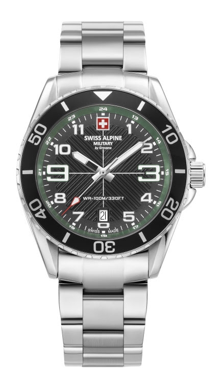 Мужские кварцевые часы в спортивном стиле. Чёрный циферблат с геометрическим гильоше, крупными арабскими цифрами, апертурой даты на «6 часах». Люминесцентный состав на элементах индикации. Широкий безель с дублирующими часовыми метками, 42-мм корпус и интегрированный браслет из нержавеющей стали.