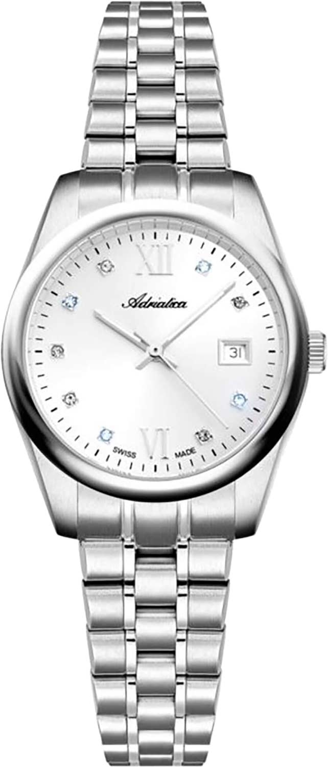 Женские наручные часы. Круглый стальной корпус. Циферблат выполнен по технологии Sunray (солнечные лучи) и защищен прочным сапфировым стеклом. Метки в виде точек с кристаллами и римских цифр VI и XII. Стрелки в стиле Baton. Окошко даты находится в положении 3 часа. Рифленая заводная головка. Браслет с раскладывающейся застежкой.