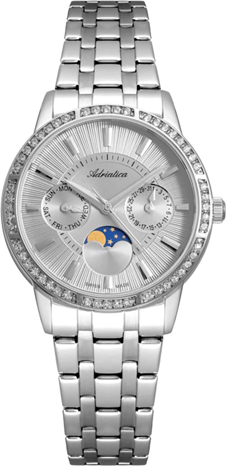 Элегантный дизайн и функциональность этого аксессуара не оставят вас равнодушной и будут радовать каждый день. Женские наручные часы Moonphase for her. Круглый стальной корпус. Безель украшен фианитами. Индикатор фазы Луны. Текстурированный циферблат с метками в виде штрихов. Число и день недели отображаются на отдельных циферблатах. Рифленая заводная головка. Браслет с раскладывающейся застежкой.