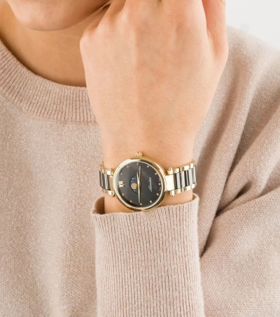 Аккуратные часы с керамическими вставками на браслете - стильное дополнение любого образа. Sophia. Женские кварцевые часы. Метки в виде точек на перламутровом циферблате. Функция отображения фазы Луны. Рифленая заводная головка.