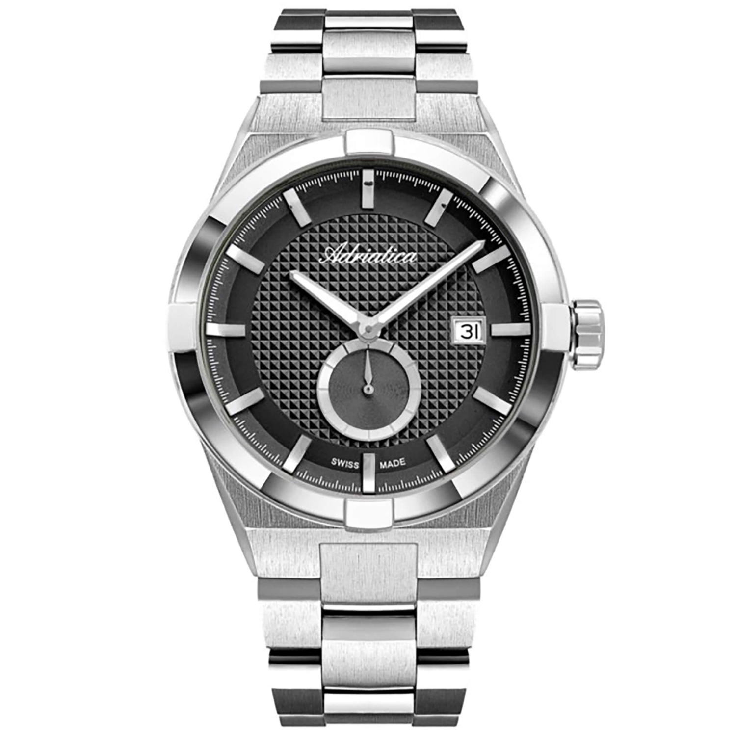 Мужские кварцевые часы с круглым стальным корпусом. Секундная стрелка вынесена на отдельный циферблат. Метки в виде штрихов. Окошко даты находится в положении 3 часа. Браслет с раскладывающейся застежкой.