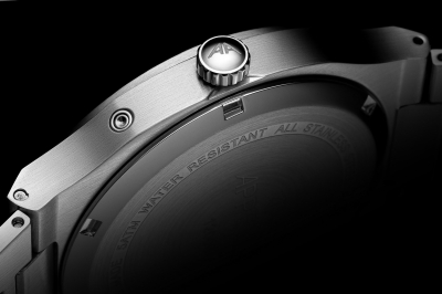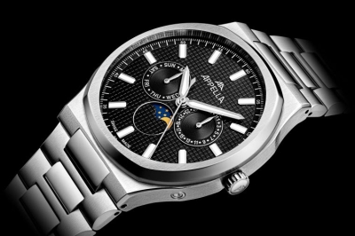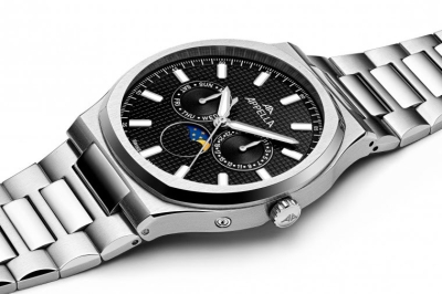 Представительные мужские часы с календарем. Коллекция Moonface. Кварцевый механизм. Черный циферблат с геометрическим узором, стрелочные указатели дней недели и даты с круговым гильоше, индикатор «лунных фаз» на «6 часах». Накладные индексы и стрелки с люминесцентным составом. 42,5-мм стальной корпус формы «подушка», сатинированный безель. Интегрированный браслет.