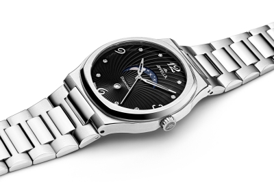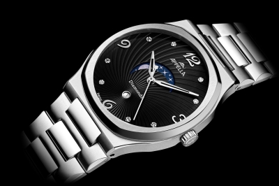 Современные женские часы с чёрным гильошированным циферблатом, украшены синтетическими бриллиантами, индикатор фаз Луны, стильный аксессуар на вашем запястье!