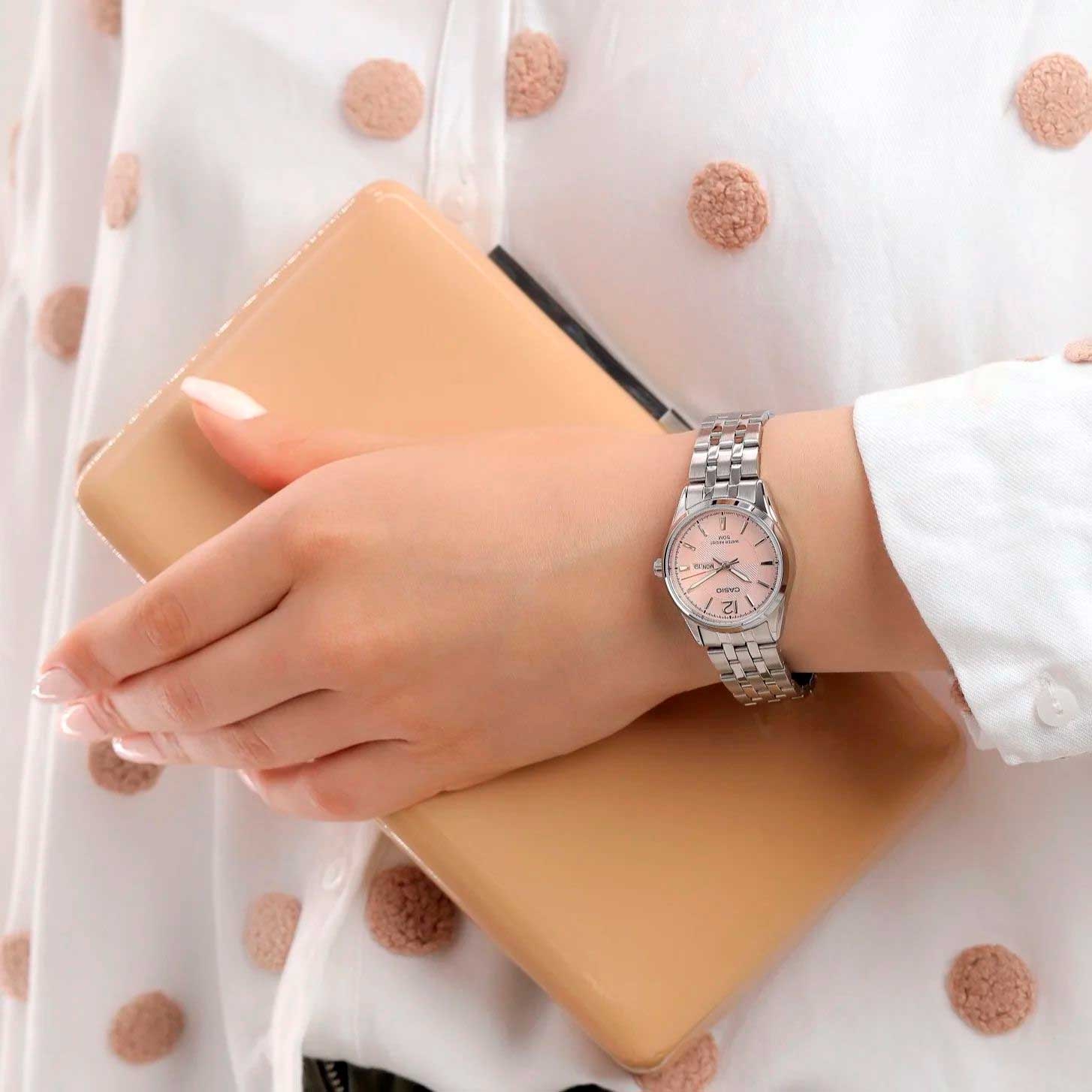 Стильный дизайн и безупречное исполнение. Часы для идеального образа любой женщины. Standard. Женские часы с круглым корпусом. Циферблат с метками в виде штрихов выполнен по технологии Sunray (солнечные лучи). Окошко даты и дня недели находится в положении 3 часа. Батарейка рассчитана на 3 года. Браслет с тройной раскладывающейся застежкой.