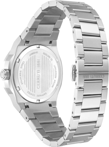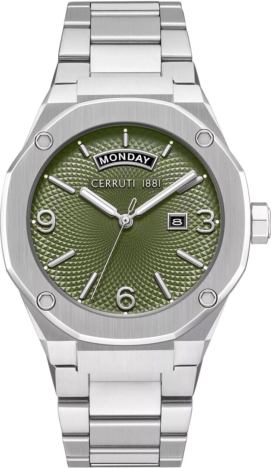Мужские наручные часы Razzuolo. Круглый стальной корпус с матовой и полированной отделкой. Восьмигранный безель с декоративными болтами. Циферблат украшен узором Clous de Paris. Накладные метки в виде штрихов и арабских цифр. Прямоугольные стрелки в стиле Baton. Метки и стрелки с люминесцентным покрытием, которое светится в темноте после непродолжительной зарядки на свету. Окошко даты находится в положении 3 часа. Окошко дня недели находится в положении 12 часов. Заводная головка в виде болта. Надежный стальной браслет с раскладывающейся застежкой.