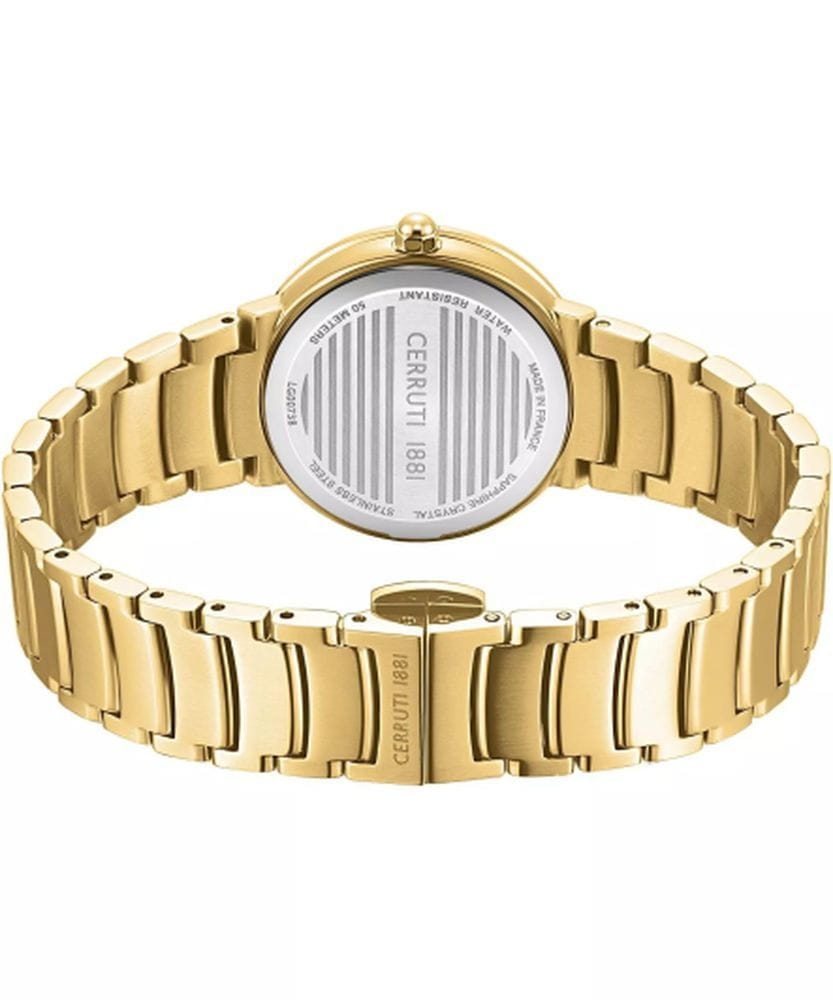 Cerruti 1881 CIWLG0073802 — элегантные женские часы, сочетающие классический стиль и сияние итальянской роскоши. Корпус и браслет из нержавеющей стали покрыты благородным золотым IP-покрытием, подчёркивающим изысканность модели. Безель с гравировкой логотипа Cerruti 1881 придаёт образу фирменную индивидуальность, а перламутровый циферблат с лучевой текстурой и кристаллическими метками создаёт игру света и глубины. Прочное минеральное стекло защищает поверхность от царапин, а металлический браслет с плавным переходом звеньев оснащён застёжкой «бабочка», обеспечивающей надёжность и комфорт при ношении. Cerruti 1881 — воплощение женственности и утончённого вкуса, идеально подходящее для повседневной элегантности и особых случаев.