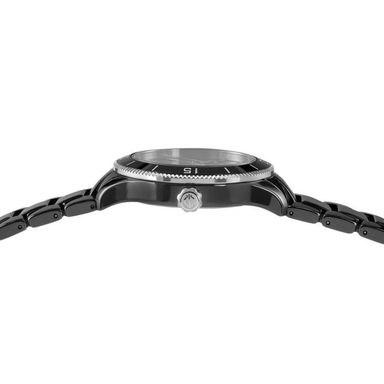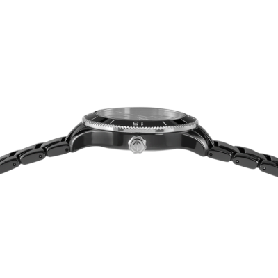 Женские кварцевые часы. Центральные часовая, минутная и секундная стрелки. Апертура даты в позиции 6 часов. Чёрный циферблат. Круглый корпус выполнен из чёрной керамики. Диаметр корпуса составляет 38 мм. Чёрный керамический браслет, раскладывающаяся застежка. Устойчивое к возникновению царапин сапфировое стекло.