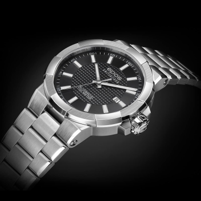Выразительный мужской аксессуар швейцарского производства. За точность хода отвечает надежный атоматический механизм от компании ETA. Черный циферблат украшает рисунок женевской волны. Индексы выполнены в форме одиночных штрихов. Sportive. Декорированный механизм, ротор украшен узором Женевские волны. Окошко даты. Прозрачная задняя крышка. Заводная головка с защитой.