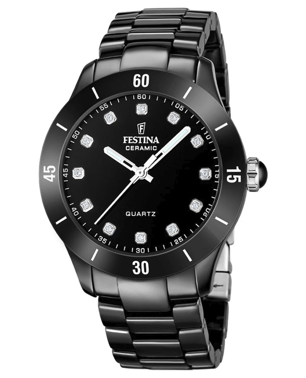 Наручные женские кварцевые часы Ceramic. Круглый керамический корпус. Керамический безель с минутной шкалой. Матовый циферблат. Накладные метки в виде точек, украшенных кристаллами. Закругленные прямоугольные стрелки в стиле Baton с люминесцентным покрытием, которое светится в темноте после непродолжительной зарядки на свету. Рифленая заводная головка. Керамический браслет со стальной раскладывающейся застежкой.