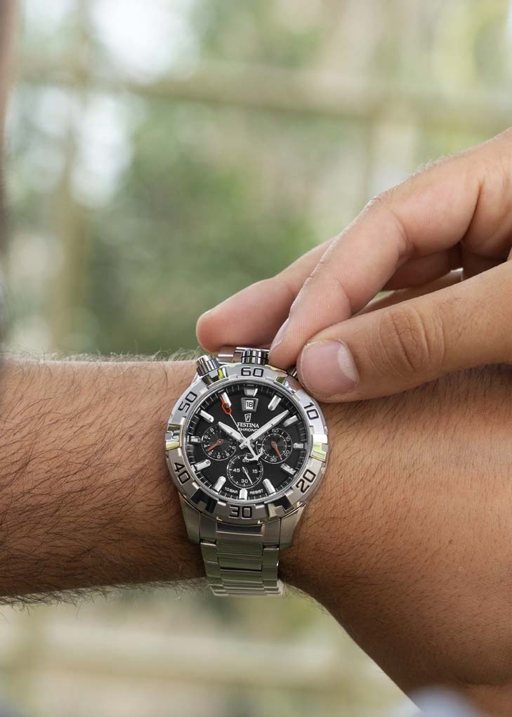 Наручные мужские часы-хронограф с секундомером. Рифленый безель с минутной шкалой. Циферблат с накладными метками в виде штрихов. Окошко даты находится в положении 12 часов. Рифленая заводная головка находится в положении 12 часов. Кнопки управления хронографом расположены в положении 11 часов и 1 час. Стальная задняя крышка крепится на 4-х винтах. Надежный стальной браслет с раскладывающейся застежкой.