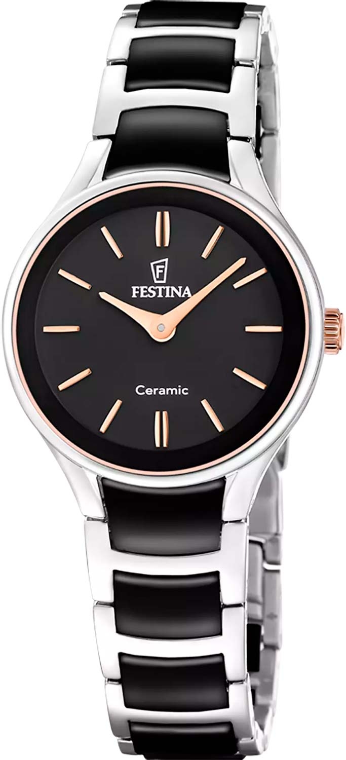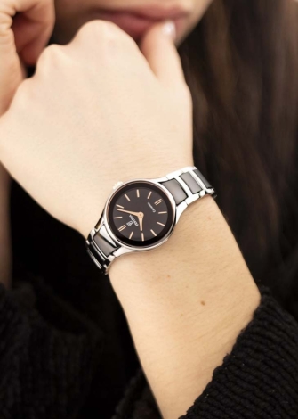 Наручные кварцевые часы Ceramic. Стальной корпус с керамической вставкой. Матовый циферблат с накладными метками в виде штрихов. Клиновидные стрелки в стиле Dauphine. Рифленая заводная головка. Стальной браслет с керамическими звеньями. Раскладывающаяся застежка.