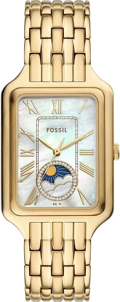Женские наручные часы Raquel Sun Moon. Прямоугольный стальной корпус. Перламутровый циферблат с метками в виде римских цифр. На отдельный циферблат вынесен индикатор день-ночь. Рифленая заводная головка. Браслет с раскладывающейся застежкой.