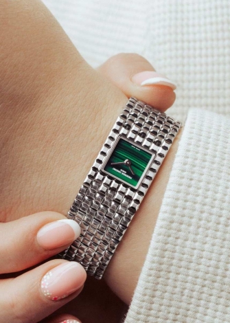 Здесь стиль стоит на первом месте. Мотив «Clou de Paris» украшает все часы множеством сверкающих, полированных квадратов с матовой отделкой в верхней части каждого звена. Сдержанный циферблат Classics Manchette, лаконичный и сосредоточенный на самом необходимом, служит строгим и элегантным корпусом для отображения времени. Он гармонично сочетается с эффектным браслетом Clou de Paris, подчеркивая баланс между функциональностью и выразительным стилем. Глубокий, насыщенный зеленый цвет малахита придает часам Classics Manchette ауру естественности и изысканности. Его уникальные волнистые линии, проходящие по поверхности циферблата подобно прожилкам драгоценного камня, приковывают взгляд и добавляют смелый, оригинальный штрих. Этот оттенок, напоминающий о богатстве земли, идеально сочетается с металлическим блеском браслета-манжеты, создавая поразительный контраст, который непременно произведет фурор.