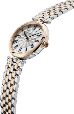 Наручные женские часы Art Deco. Круглый стальной корпус. Перламутровый циферблат, центральная часть украшена узором. Метки в виде римских цифр. Тонкие стрелки в стиле Breguet. Рифленая заводная головка в форме луковицы, украшена камнем в форме кабошона. Надежный стальной браслет с раскладывающейся застежкой.