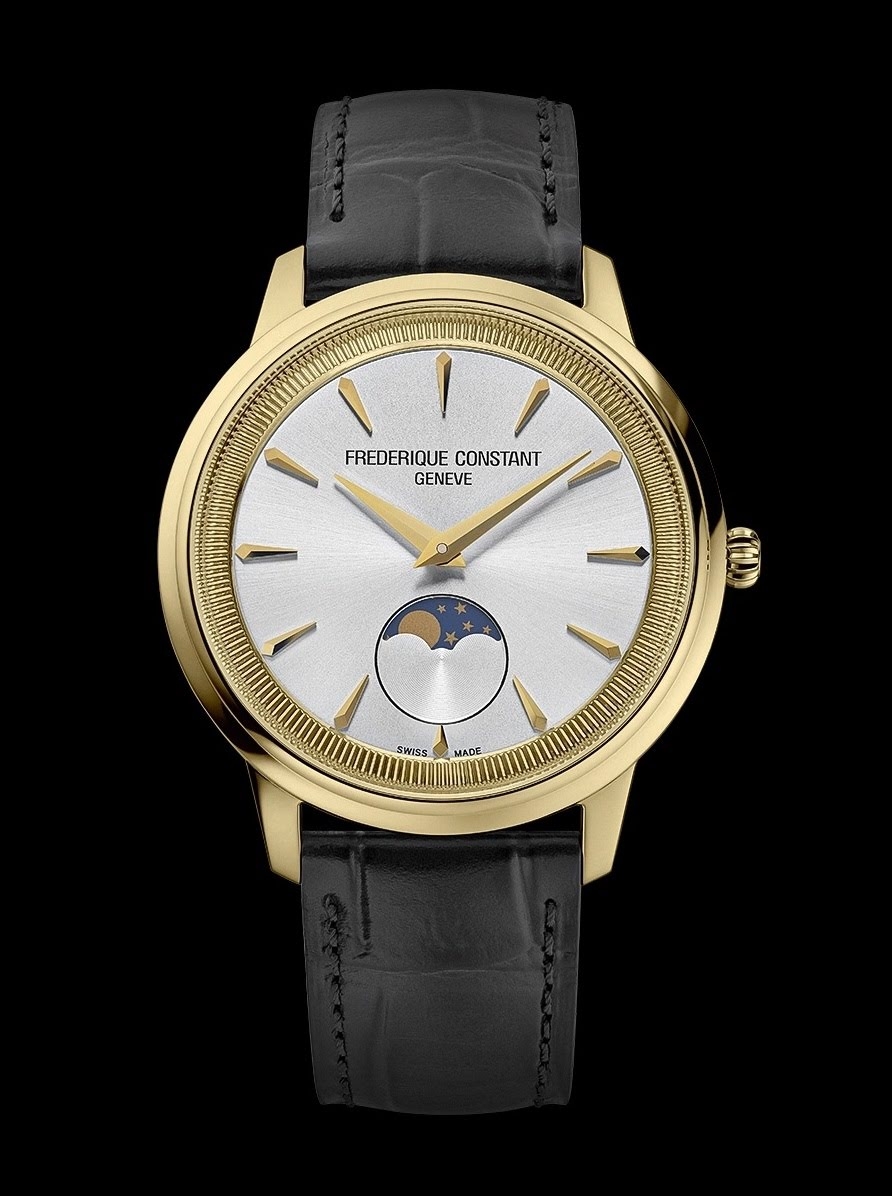 Коллекция Classics Moneta Moonphase от Frederique Constant отличается рифленым ободком, напоминающим край монеты, что и дало ей название. Доступные в корпусе диаметром 37 мм, каждые часы оснащены кварцевым механизмом, что делает их столь же привлекательными, сколь и доступными. Часы этой коллекции отличаются изящным циферблатом с эффектом солнечных лучей и индикатором фаз Луны на отметке «6 часов». Эта модель выделяется полированным корпусом из нержавеющей стали с PVD-покрытием из желтого золота. Стрелки «дофин» и накладные часовые метки, также из желтого золота, придают часам классический, высококлассный вид. Серебристый циферблат имеет эффект солнечных лучей. Часы защищены выпуклым сапфировым стеклом с антибликовым покрытием и водонепроницаемы до 5 атмосфер. Они оснащены темно-коричневым ремешком из телячьей кожи с тиснением под крокодила и застегиваются на пряжку.