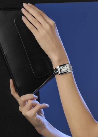 Прямоугольный стальной корпус. Матовый циферблат с метками в виде римских цифр защищен прочным сапфировым стеклом. Секундная стрелка вынесена на отдельный циферблат. Рифленая заводная головка. Задняя крышка крепится на 4-х винтах. Браслет с раскладывающейся застежкой.