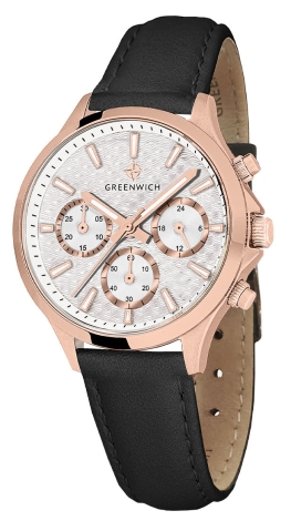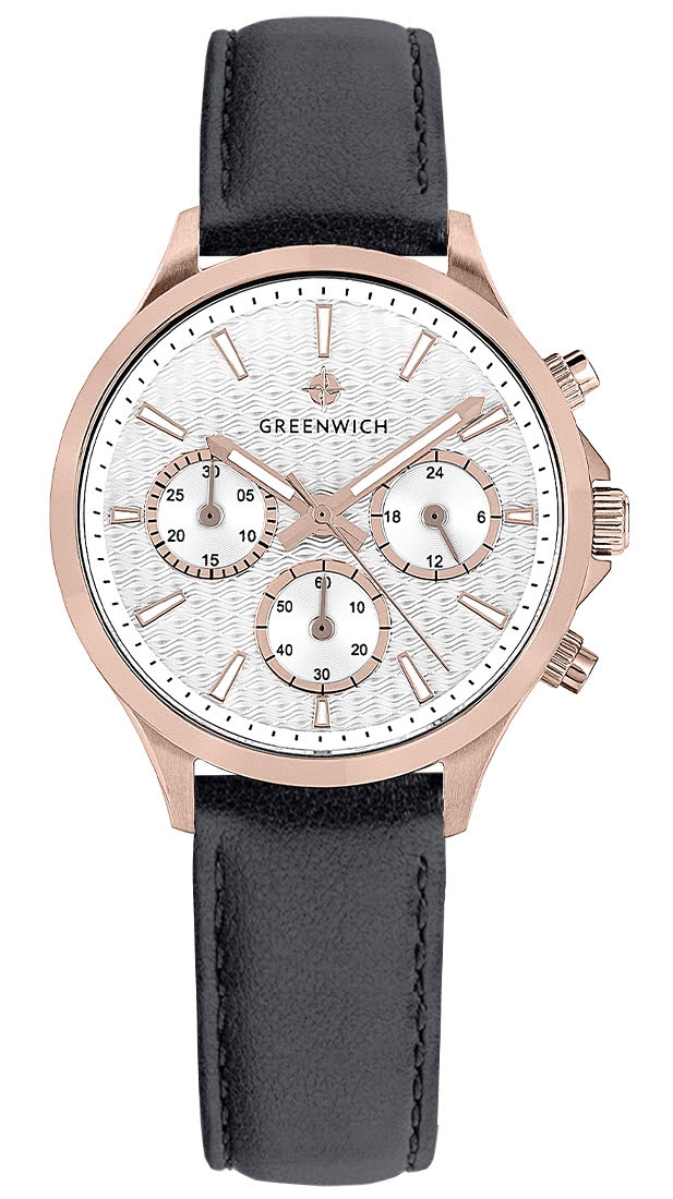 Часы GW 363.41.33 серии Mermaid - находка для тех, кто ищет надежные и, в тоже время, элегантные часы. Кварцевый механизм, установленный в 35-миллиметровый корпус из нержавеющей стали с PVD-покрытием из розового золота, оснащен функционалом хронографа: вынесенные на дополнительные индикаторы стрелки позволяют засекать время в минутах и секундах. Кроме этого, на белом циферблате разместили индикатор 24-часов. Каждый из индикаторов выделен накладной рамкой с зеркальной полировкой. Накладные риски и центральные стрелки покрыты люминесцентным составом. Элегантность модели подчеркивает гильоше: выполненное в виде волнообразных линий, оно дарит циферблату объем и глубину. В часах установлено минеральное стекло. Водостойкость 10 атмосфер. Хронограф серии Mermaid можно приобрести на ремешке из натуральной кожи черного цвета. Застежка-пряжка выполнена из нержавеющей стали.