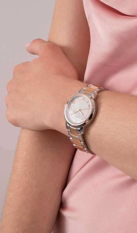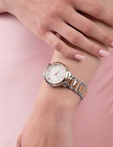 Элегантный женский аксессуар добавит вашему образу особый шарм. Dawn. Женские часы с круглым корпусом. Циферблат с метками в виде штрихов и римских цифр. Безель украшен декоративными винтами. Браслет с раскладывающейся застежкой.