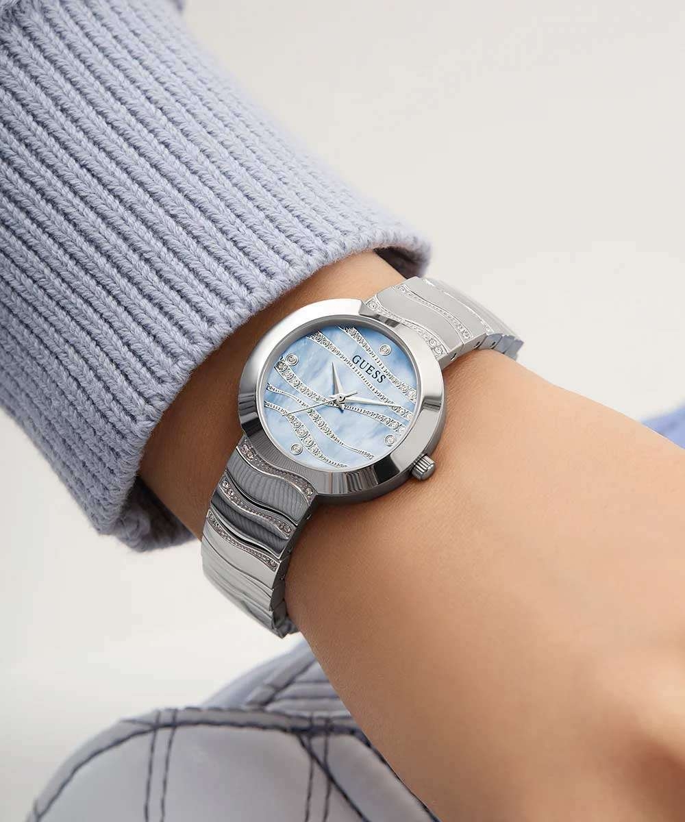 Часы Guess GW0871L1 — это стильный и утонченный аксессуар, который прекрасно дополнит образ современной женщины. Стальной браслет с волнообразными звеньями и раскладной застежкой обеспечивает комфортное и надежное ношение, а также украшен кристаллами, что добавляет блеска и привлекательности.