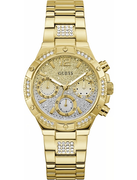 Добавьте блеска своему стилю с этими прекрасными часами! 38-миллиметровый золотой корпус украшен кристаллами на безеле и великолепно сочетается с многофункциональным циферблатом с градиентом из золота и серебра. Полированный браслет из нержавеющей стали золотого цвета с кристаллами завершает этот ослепительный образ!