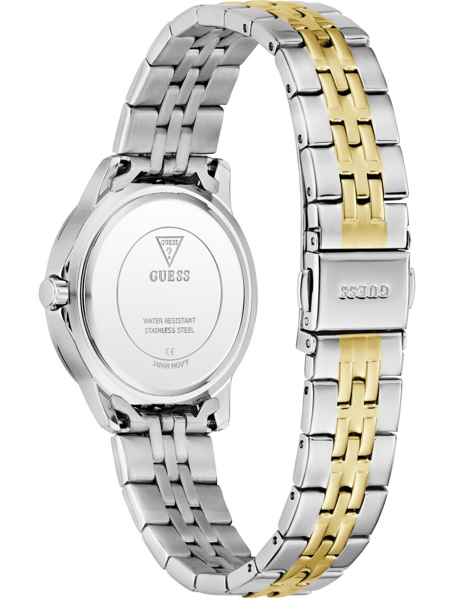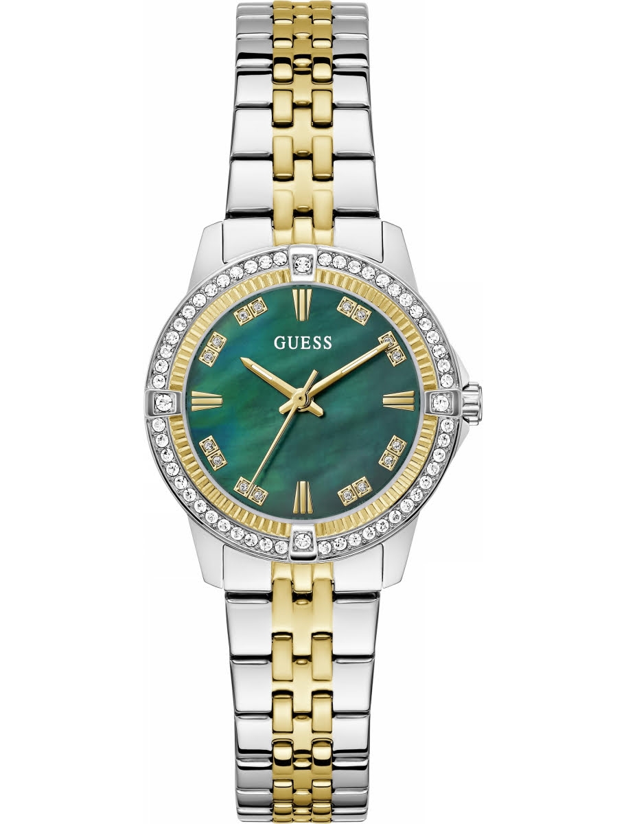 Женские наручные часы Guess GW1027L3. Круглый корпус выполнен из стали и декорирован кристаллами на безеле, перламутровый зелёный циферблат имеет классический дизайн.