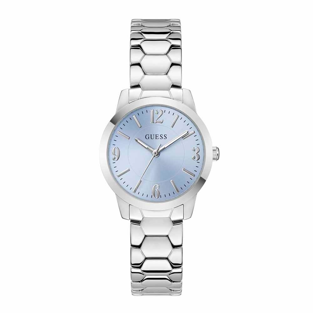 Женские наручные часы Guess GW1028L1. Круглый корпус серебристого цвета выполнен из стали, голубой циферблат имеет классический дизайн. Часы оснащены металлическим браслетом в цвет корпуса.