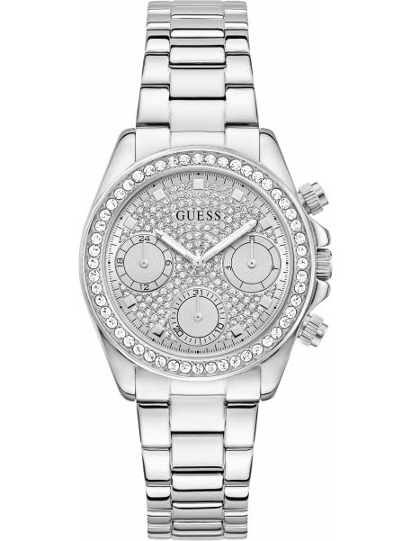 Женские наручные часы Guess GW1037L1. Круглый корпус серебристого цвета выполнен из стали и украшен кристаллами по безелю, циферблат выложен прозрачными кристаллами, в дополнительных циферблатах отображается дата, день недели и время суток. Часы оснащены металлическим браслетом в цвет корпуса.