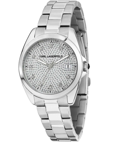 Женские наручные часы. Круглый стальной корпус. Циферблат с монограммой KL дополнен логотипом бренда и защищен минеральным стеклом. Метки в виде штрихов. Заостренные прямоугольные стрелки в стиле Baton.Метки и стрелки с люминесцентным покрытием, которое светится в темноте после непродолжительной зарядки на свету. Окошко даты находится в положении 3 часа. Рифленая заводная головка с защитой. Браслет с раскладывающейся застежкой.