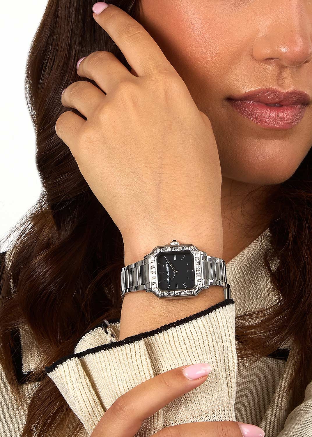 Женские наручные часы. Корпус из нержавеющей стали декорирован кристаллами. Матовый циферблат дополнен логотипом бренда и защищен минеральным стеклом. Метки в виде штрихов. Заостренные прямоугольные стрелки в стиле Baton. Секундная стрелка отсутствует. Рифленая заводная головка с защитой. Браслет с раскладывающейся застежкой.