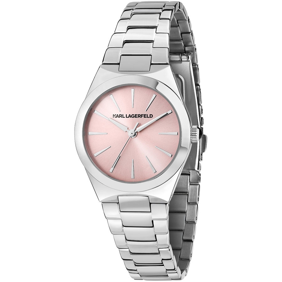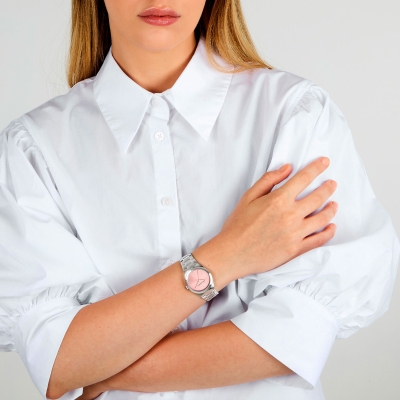 Женские кварцевые часы. Центральные часовая, минутная и секундная стрелки. Розовый циферблат. Круглый корпус выполнен из нержавеющей стали. Стальной браслет, раскладывающаяся застежка.